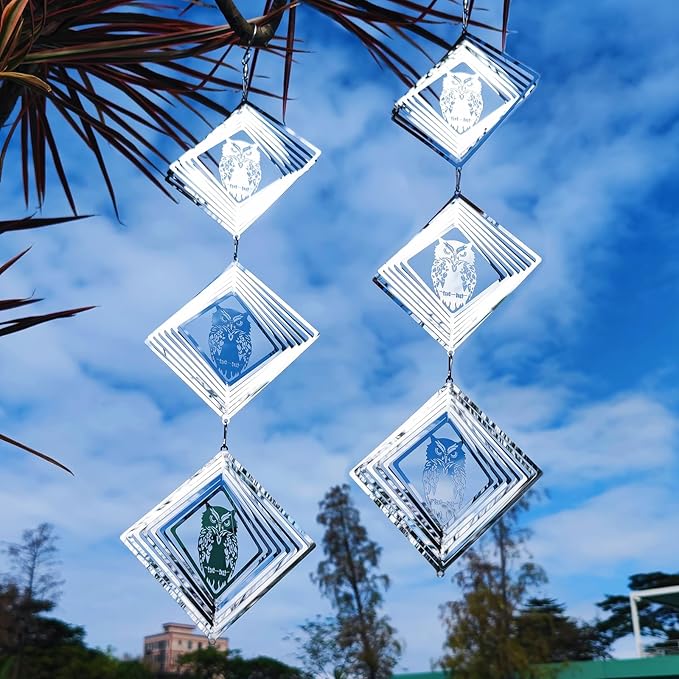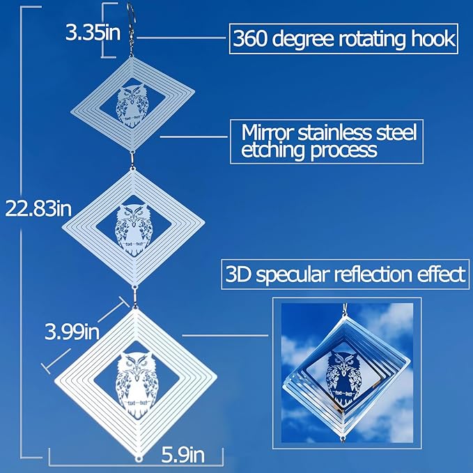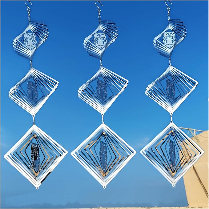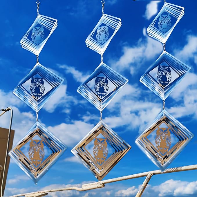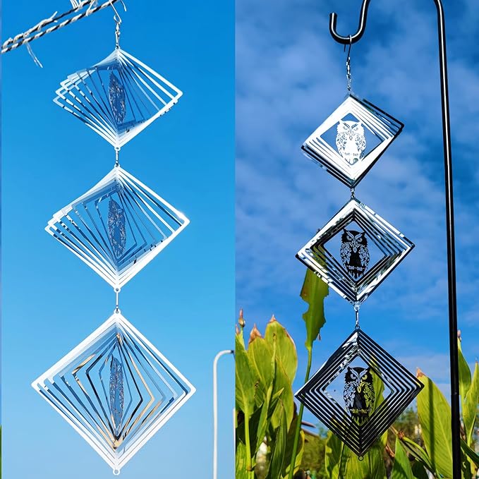 • Best Bird Scarer to Keep Birds Off: Our owl bird repellent wind spinner device humanely scares them away by reflecting visual light.Easily mount these bird blinder repellent wind spinners on your area with direct sunlight and breeze for effective use.They are so beautiful as they spin in the wind and reflect sunlight.