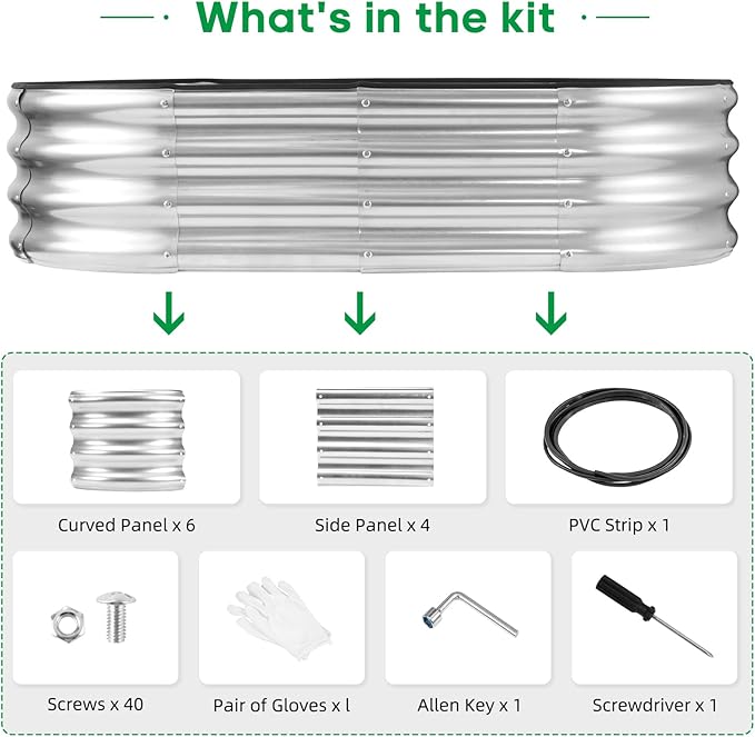 • What You Get: we have included Galvanized raised garden bed kit with detailed assembly instructions, rubber edge strips, safety gloves , wrench tools and with galvanized nuts and bolts in the box .These essential tools elevate your overall planting and gardening adventure.