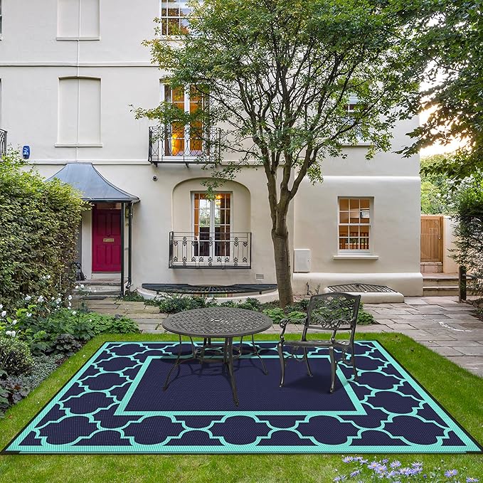 GENIMO 6' x 9' Outdoor Rug Waterproof for Patio Decor, Foldable Reversible Plastic Straw Area Rugs Mat for Camper, Outside Carpet for Rv, Deck, Porch, Picnic, Beach, Balcony, Navy Blue & Jade Green