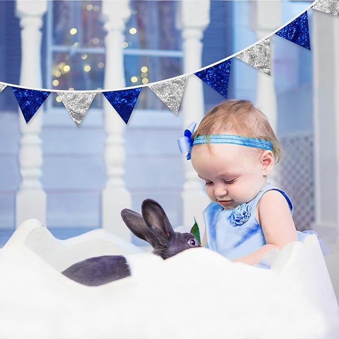 • Package Contains - 1 packs of sequin silver blue party pennant banner, Each string is 8ft with 12pcs flag,Size of each flag is 5.31 x 4.72 inch.