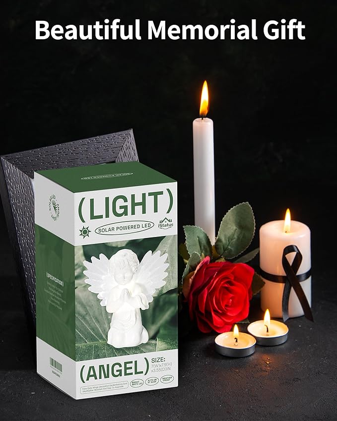 • ☀️ Solar Powered: Eco-friendly and cost-effective; Charges during the day (within 5-8 hours) and automatically illuminates the angel statue at night for 6-8 hours.