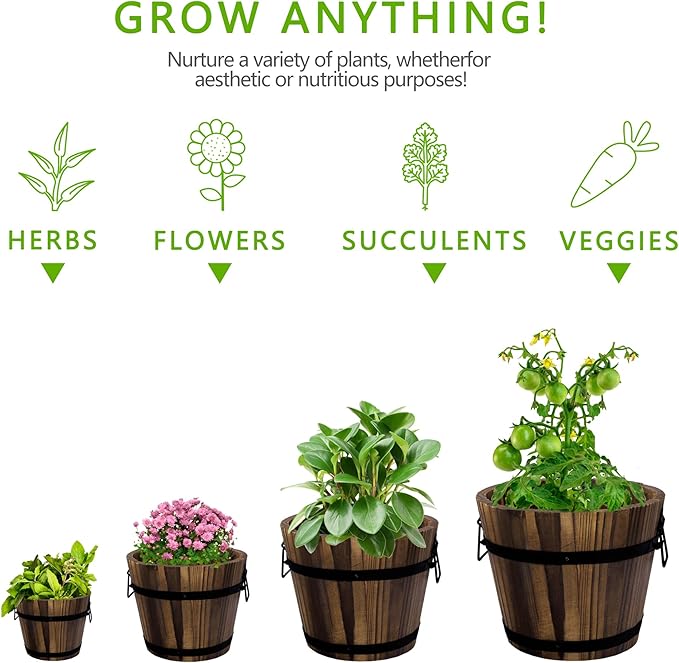 • 【Durable Material】Our whiskey barrel planter is made of antiseptic wood, ensuring great strength and durability,which means it can withstand harsh sunlight and harsh winters,you can use it indoors and outdoors freely.