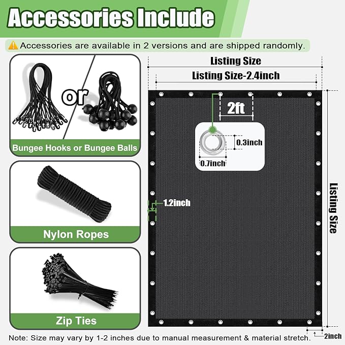 • [Easy Installation with Accessories] Heavy duty Stainless steel grommets are installed every 2' on each side, and the included nylon ropes, bungee hooks (or bungee balls, depending on the product version), zip tie make installation even more flexible and easy for one person.