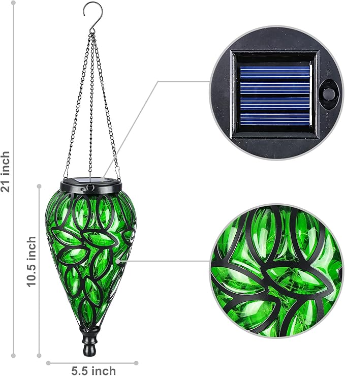 • Unique Design: Translucent plastic ceiling lantern features an inverted teardrop shape surrounded by a leaf frame metal cage with a plastic lampshade in green. The solar hanging lantern will sparkle in the sunshine during the day.