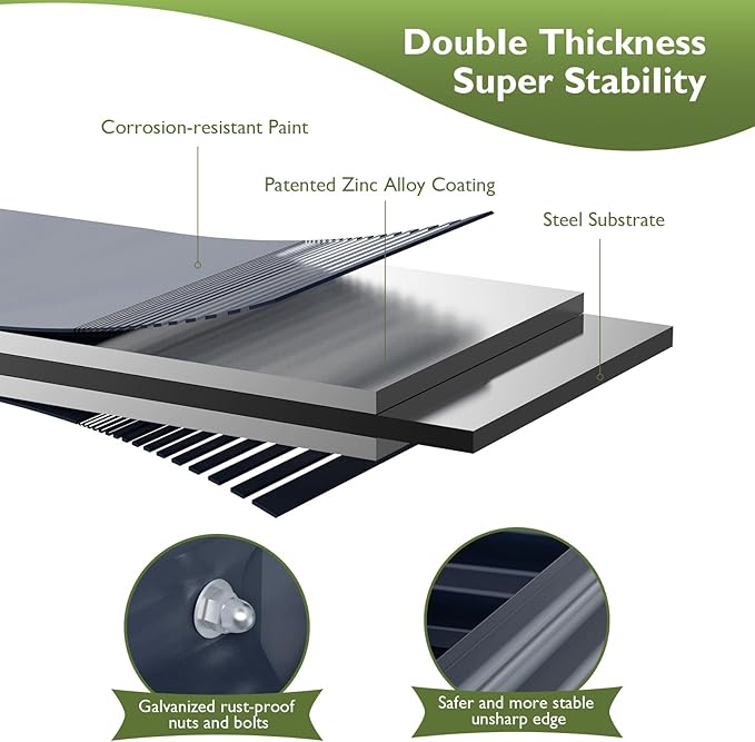 • Attractive Elevated design: Outdoor elevated garden beds with legs are more durable than wooden garden beds. Lift-up design allows you to take care of your plants without bending down. The 4 corners are protected with pads, which Protects you from scratches during installation and planting. The garden box brings great convenience to our planting life, also make your yard a delightful photo spot