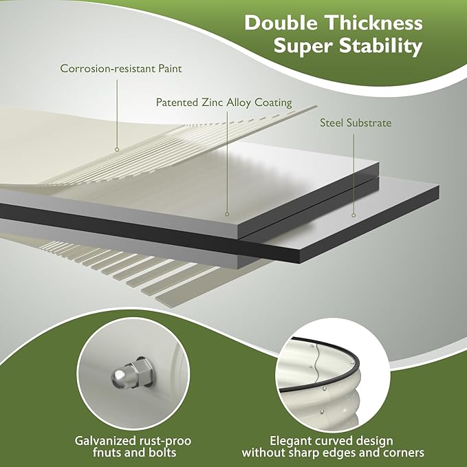 • Oval Designed & Galvanized Material: Raised garden beds outdoor is made of double-layer galvanized metal sheet with anti-rust coating to avoid rusting. The nuts and bolts are also galvanized. Elegant oval design with firm structure and no sharp corners