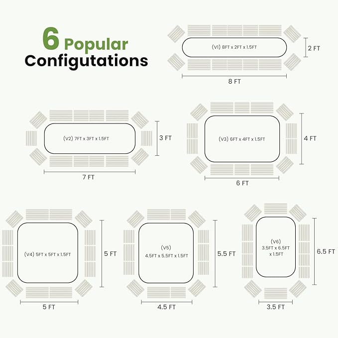 • Standard size and popular color: The raised garden bed is 8x2x1.5ft, with 4 bent panel, 6*1FT and 4*1.5FT straight panels. You can assemble them into 31 possible configurations to fit your plants, and choose your optimal configuration based on the layout of your gardening area. Two steel support bars help the panels keep their shape, preventing warping and soil leakage over time.