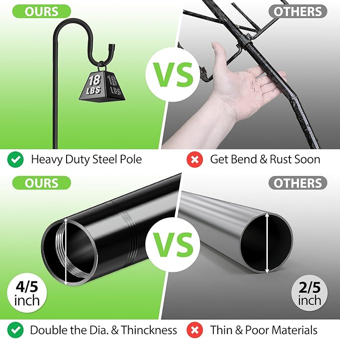 • Heavy Duty: Made of high-quality steel with a rust-proof finish, this outdoor bird feeder pole is sturdy enough to hold a heavy suet feeder and even climb squirrels without bending or breaking.