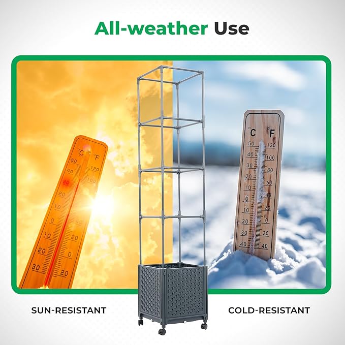 • HIGH QUALITY & DURABILITY: This tomato planter box is made from fade-proof and reinforced PP material, featuring a sturdy alloy steel trellis frame for minimal maintenance. It excels in all-weather conditions, from scorching summers to frigid winters, making it a versatile choice for outdoor plant decoration.
