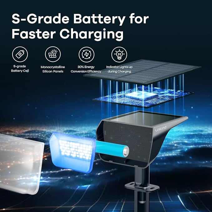 • Long-Lasting Battery & Solar Charging: A powerful 1,500mAh lithium polymer battery provides extended illumination. Solar lights are outdoor waterproof with up to 30% energy conversion efficiency and charge efficiently in sunlight. For best results, charge for 48 hours before first use