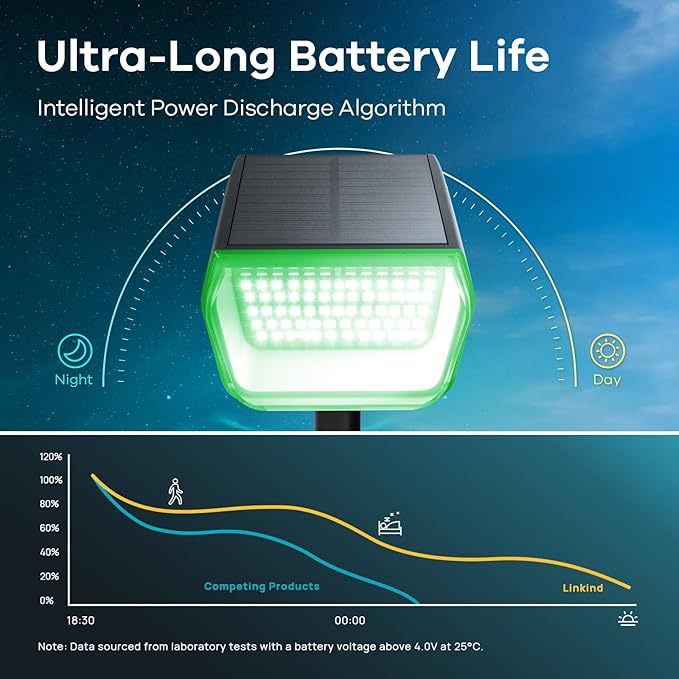 • Enhanced Multicolor Design: Linkind’s solar lights outdoor feature 10 color modes, including Red, Pumpkin-Orange, Yellow, Green, Blue, Indigo, Purple, 2700K warm white, 6500K cool white, and a dynamic Color Cycle mode. Switch effortlessly with a single click, and hold for 3 seconds to turn off