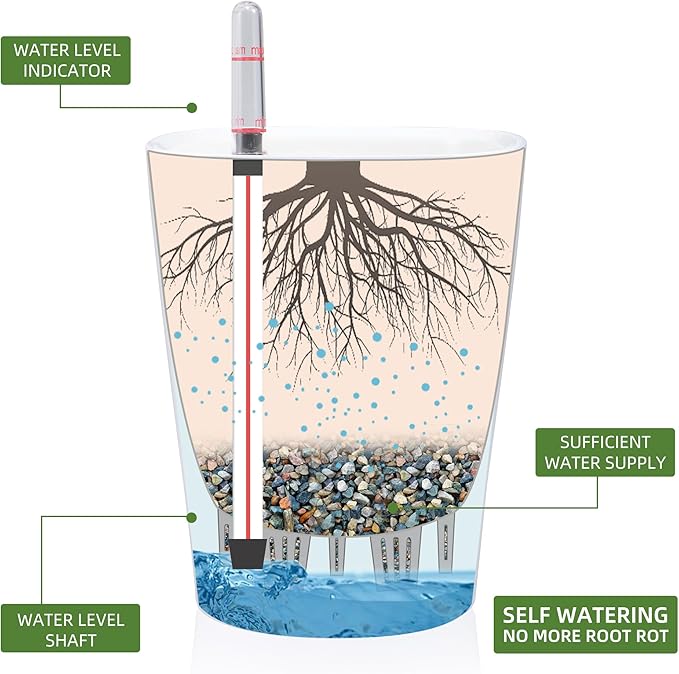 • NEVER MISS WATERING AGAIN - The hydroponic device keeps water ready, then watering time is at your discretion on the gauge. The design of drainage plug and spillway hole is to avoid cycles of overwatering and underwatering, pull out the plug to drain the excess water on rainy days outdoors. The sufficient water supply system enables double the water-efficient than conventional pots. Don't be anxious about missing watering while you enjoy a long term holiday on a journey or travel outside