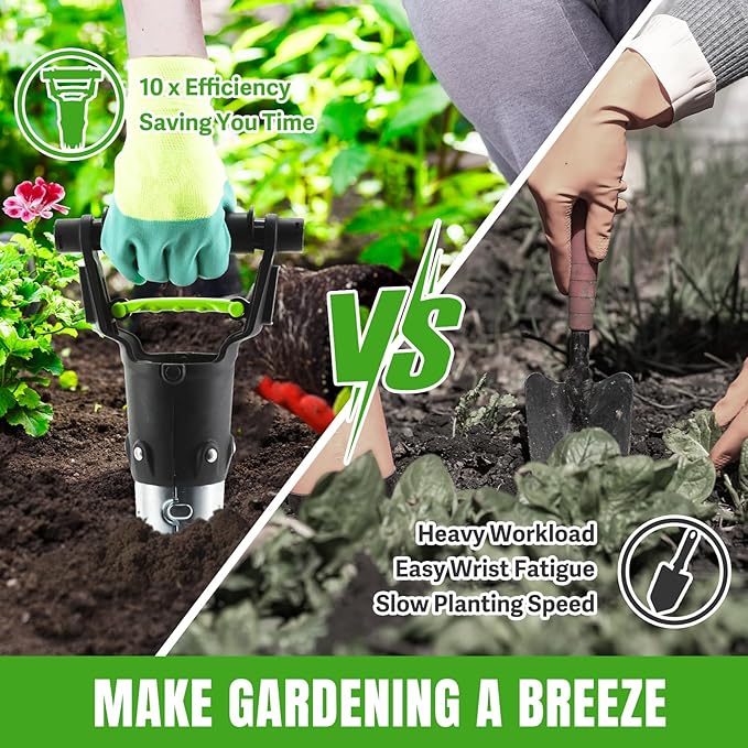 • EFFICIENT TRANSPLANTING: Ordinary digger shovel often creates holes that are excessively wide and sometimes not deep enough. This garden bulb planter tool is fantastic—simply twist and turn it once in the ground, and you'll have the perfect-depth hole for planting bulbs. The Automatic soil release mechanism accelerates the planting process, saving a considerable amount of time.