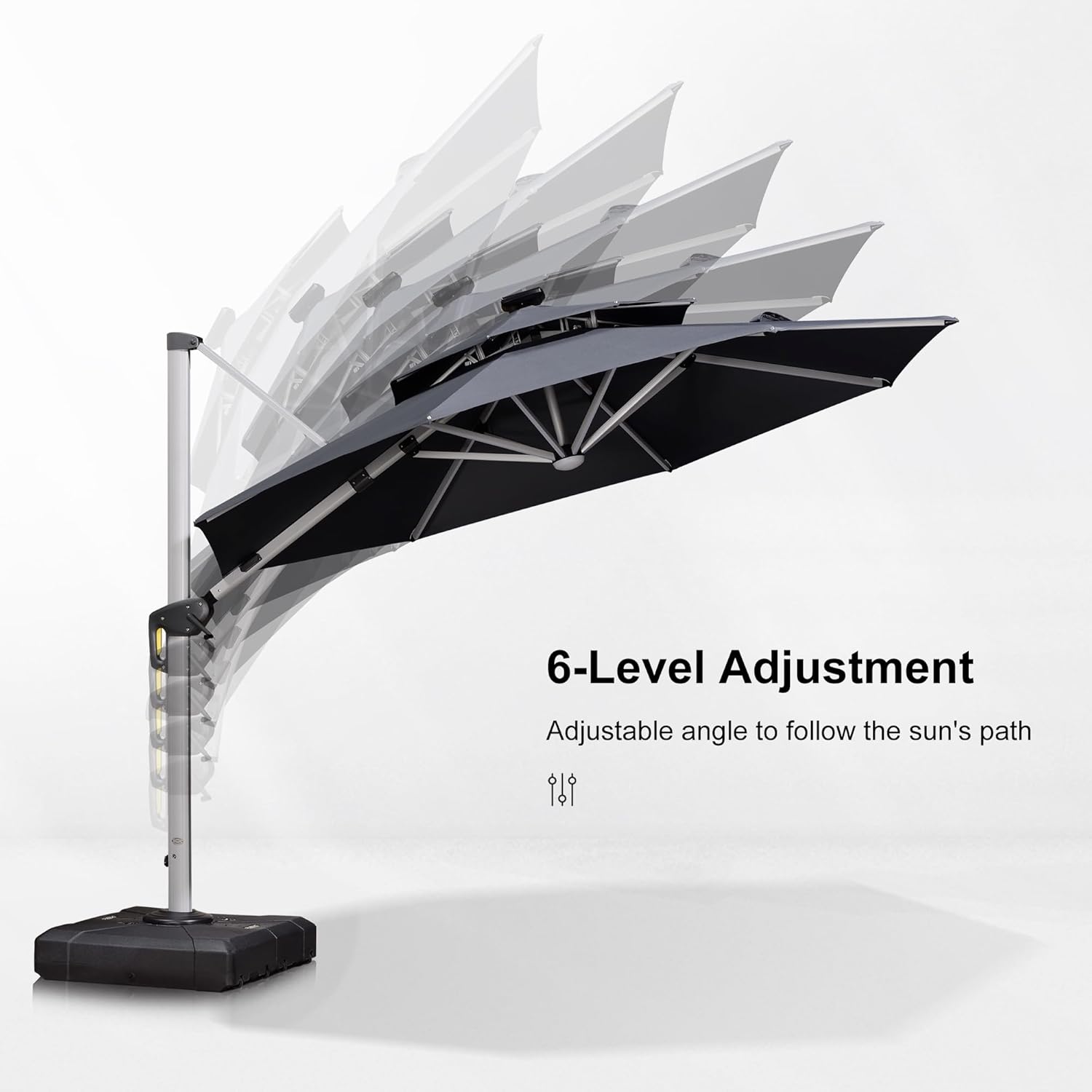 PURPLE LEAF 10ft Patio Umbrella With Base Solar powered LED Cantilever Umbrella with LED lights Windproof Outdoor Offset Umbrella for Garden Deck Pool Patio, Grey