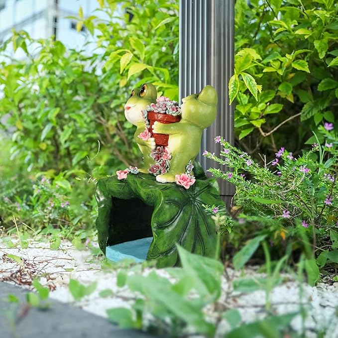 • PERFECT GIFT IDEAL: Give this solar garden frog statue away as a funny novelty Birthday, Christmas gift or housewarming gifts and you would be rest assure it will be appreciated. This unique rain gutter spouts will immediately enhance your garden decor and friendly to your garden and do no pollution.