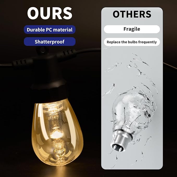 • IP66 Waterproof String Lights: With an IP66 waterproof rating, our hanging string lights can withstand rain, sun, wind, snow, humidity, and extreme outdoor temperatures. The LED bulbs are made from high-quality industrial-grade PC material and are designed to survive accidental collisions and drops.