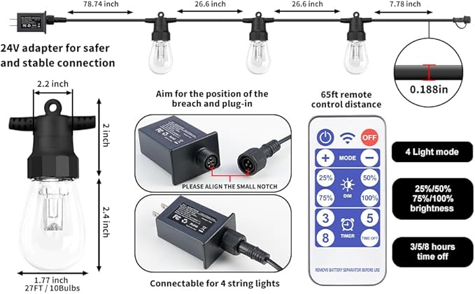 • Dimmable String Lights: Customize the brightness of these patio lights to 25%/50%/75%/100% to set the perfect mood with the dimmable feature. With the remote that comes with the product, you can easily schedule your patio string lights to turn off automatically after 3/5/8 hours.