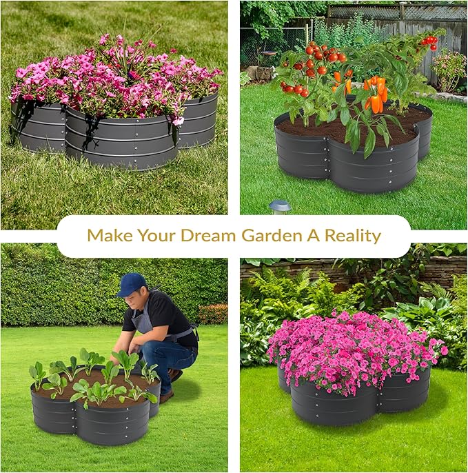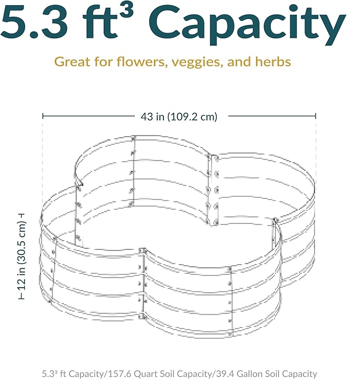 • AMPLE SPACE FOR HEALTHY GROWTH: This galvanized metal garden bed has a unique clover shape that provides plenty of room for growing a variety of deep-rooting plants in the backyard. The raised planter box measures 43" W x 43" D x 12" H, weighs 9.2 lbs, and has a soil capacity of 39.4 gal (5.27 cu ft).