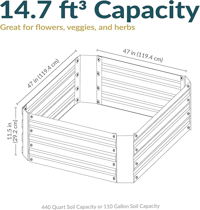 • GROW BEAUTIFUL PLANTS AND FLOWERS: This galvanized steel raised garden bed measures 47" W x 47" D x 11.5" H and weighs 12.8 lbs. It has a soil capacity of 110 gal (14.7 cu ft).