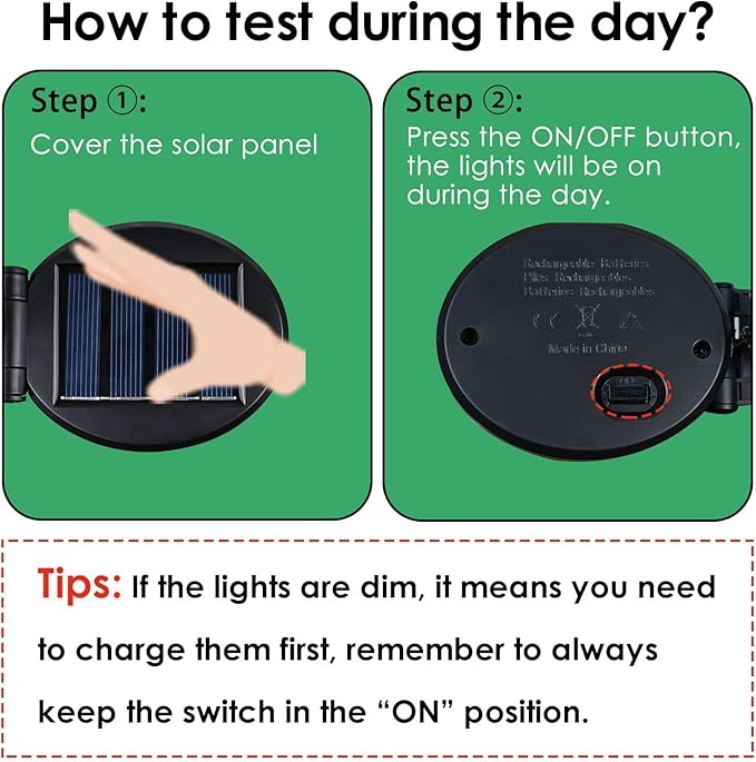 • ESAY INSTALLATION:No plugs, cords, or expensive installation is required. Just flip the switch, attach the lights to the metal sticks provided, and then stick them into the ground.