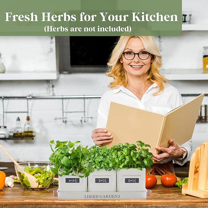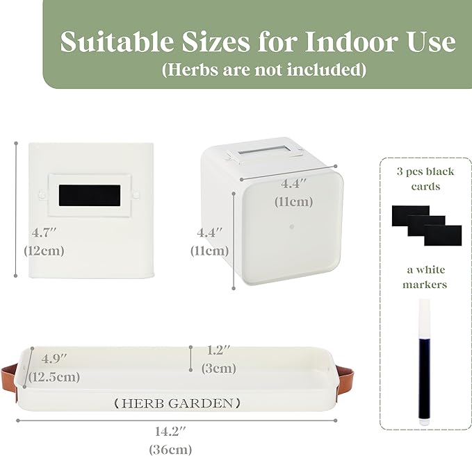 • 【Windowsill Herb Garden】Our window herb garden includes three pots and a tray with a handle, with each pot measuring 4.4" W x 4.7" H, and the tray measuring 14.2" L x 4.9" W x 1.2" H. It's ideal for growing a variety of herbs such as mint, rosemary, basil, thyme, etc. Tailored for herb growth, our indoor herb pots provide an optimal environment for nurturing your herbs. Their farmhouse design and compact size make them perfect for placement on a windowsill or kitchen countertop.