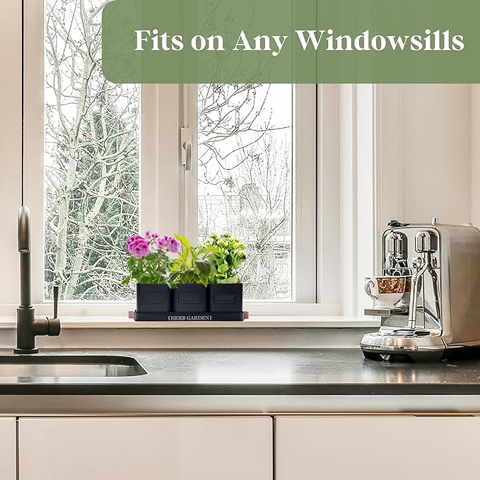• 【Windowsill Herb Garden】Our window herb garden includes three pots and a tray with a handle, with each pot measuring 4.4" W x 4.7" H, and the tray measuring 14.2" L x 4.9" W x 1.2" H. It's ideal for growing a variety of herbs such as mint, rosemary, basil, thyme, etc. Tailored for herb growth, our indoor herb pots provide an optimal environment for nurturing your herbs. Their farmhouse design and compact size make them perfect for placement on a windowsill or kitchen countertop.