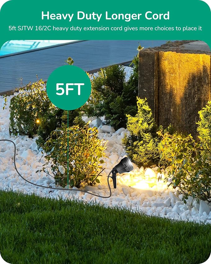 • [Easy Setup in Seconds] The small spotlight outdoor features a lamp head that can rotate 180 degrees, offering flexible installation angles; a 5ft SJTW 18/2C extension cord provides a larger installation range to meet the needs of long distances; easy to install on your own, no professional electrician knowledge required