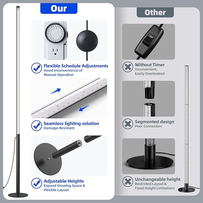 • Adjustable Height for Flexible Lighting : Experience the versatility of our upgraded vertical grow light. With an adjustable height range of 4ft-5.6ft, it caters to tall plants and large plant shelves, ensuring optimal illumination