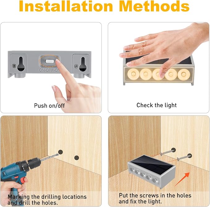 • 【10-12H Long Lighting】Solar LED step light come with high-quality solar panel in the case of sufficient sunshine, the solar charging time is 5-6H, which is enough to supply power to the warm white step light for up to 10-12H. Push on/off: pushing left or right means turning on the light, easy to operate and save your precious time.