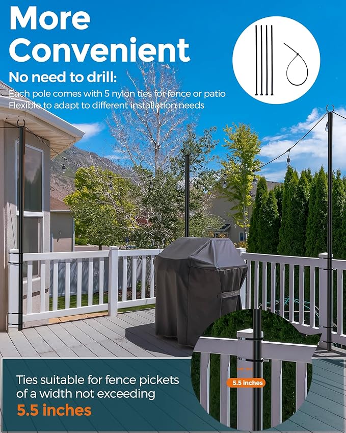 • 【NO DRILL FOR FENCE】: Just tighten the tie, no need for tedious drilling.Each light pole come with 5 outdoor-specific nylon self-locking cable ties, which can be used to fix on fences such as garden, patio, deck, etc.; The length of the ties is 15.7'' (40cm), and is suitable for wooden or iron fences with a width not exceeding 5.5'' (14cm). Please measure the fence size before purchasing.
