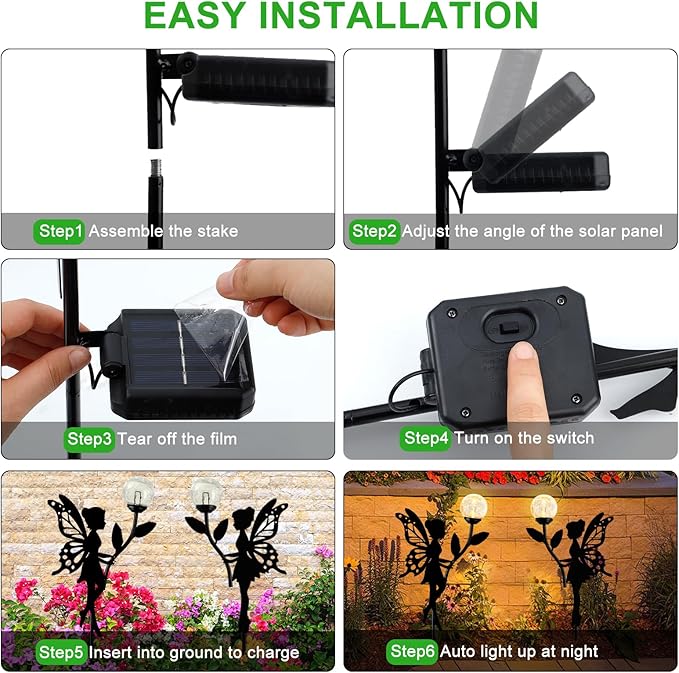• Easy to Use: Installing the solar garden lights outdoor is effortless; Just attach the ground garden stakes to the fairy statues and insert them in a location that receives ample sunlight during the day, then let the sun do the rest