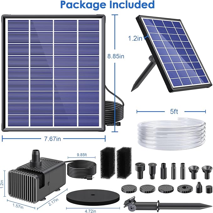• ⛲【Easy to Install】The solar powered water pump is plug and play, once the solar panel in direct sun, it will start working auto within seconds. The solar panel equipped with 180° rotatable ground stake which can be inserted to the ground or mounted on the wall. The pump can be float on the water with floating foam or submerged under water with suckers.