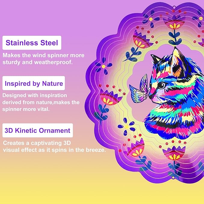 • 【3D Kinetic Wind Spinner Decoration】The dynamic wind spinner adopts a colorful appearance and is inspired by the animal image of a cat. The unique design combines a 3D streamer effect to make it look more visual.