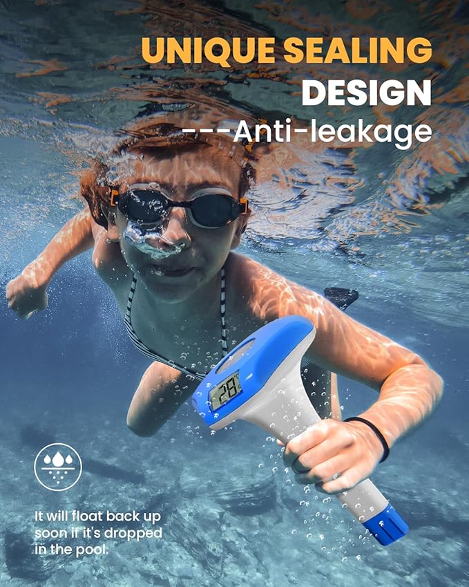 • 🍅UPGRADED IPX8 WATERPROOF: Our pool thermometer has been upgraded to IPX8 waterproof rating, specially crafted to stop rust, fogging, malfunction, and dirt buildup, keeping out water, dust, and sand, thus maximizing the life of the pool thermometer.