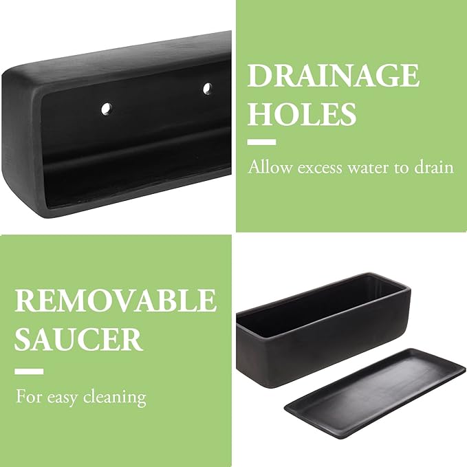 • Modern window box style rectangular 10 inch long matte black ceramic planter with removable drip tray, perfect size for your windowsill, display shelf, or desktop
