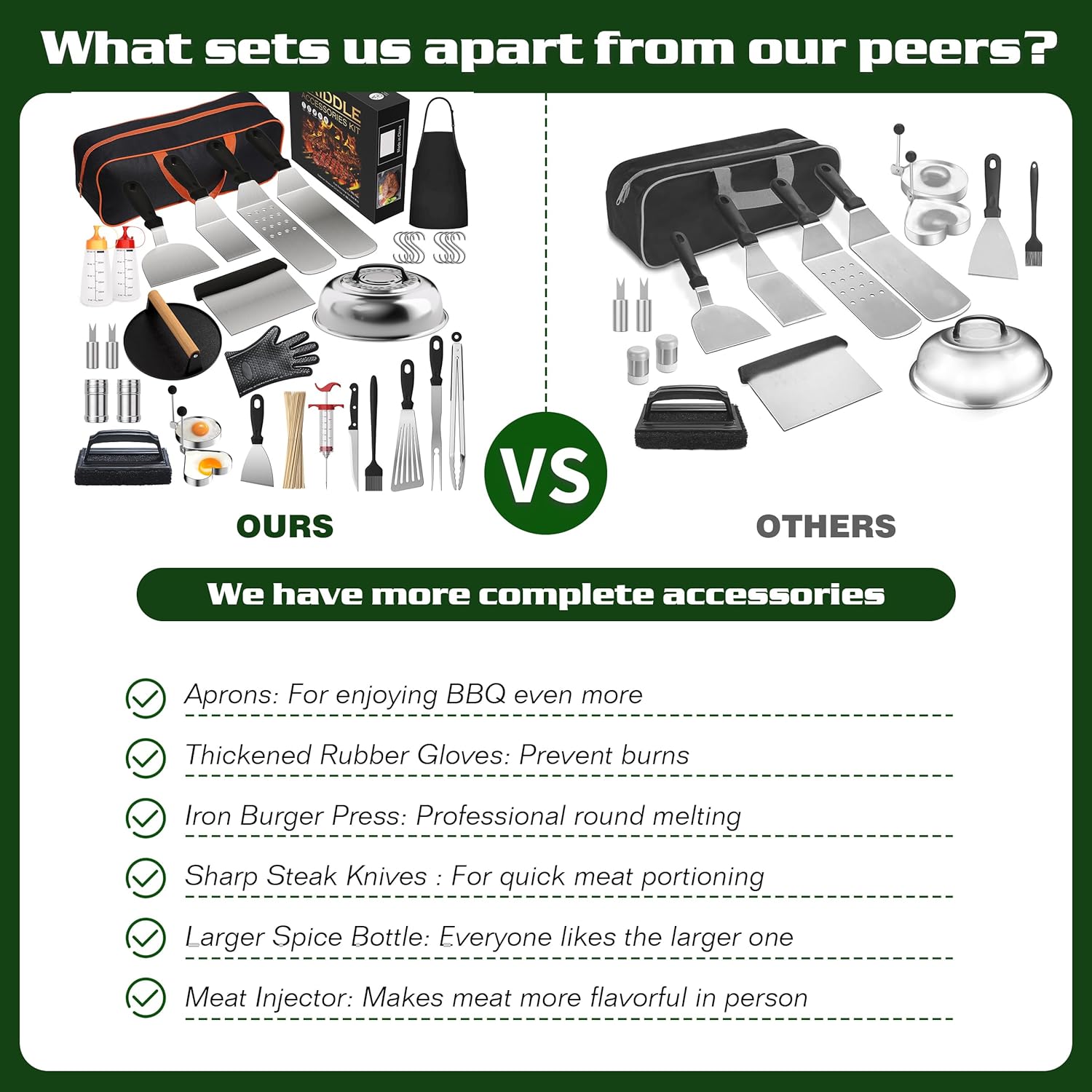 • 【Premium Quality】: Our Furnhome 134pcs Griddle Accessories Kit is crafted with heavy gauge stainless steel, ensuring durability and long-lasting performance. You can trust that our BPA-free, rust-resistant, and durable tools won't crack or melt with long-term use. Say goodbye to flimsy tools that bend or break easily during outdoor grilling sessions.