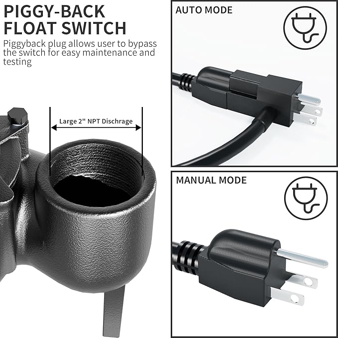 • [AUTOMATIC FLOAT SWITCH] Adjustable float switch automatically turns on/off the pump depending on water level in sump basin or septic pit. When the water level rises above the pump, the pump will automatically start working. When the pump can not pump water, it will automatically disconnect the power