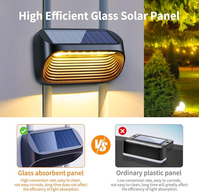 • 【Upgraded Tempered Glass Solar Panel】 Our fence solar lights adopt the cadmium telluride solar panel, which has a high light absorption rate and a conversion efficiency up to 30%. The solar fence lights can also be charged on cloudy days. With this excellent performance, our solar deck lights outdoor waterproof can stay lit for 10-12 hours at night after charging in the sun. Plus, solar panels of the deck lights solar powered are easy to clean, won't corrode, and don't affect the light absorption efficiency over time. Give your outdoor landscape a lasting and gorgeous lighting effect