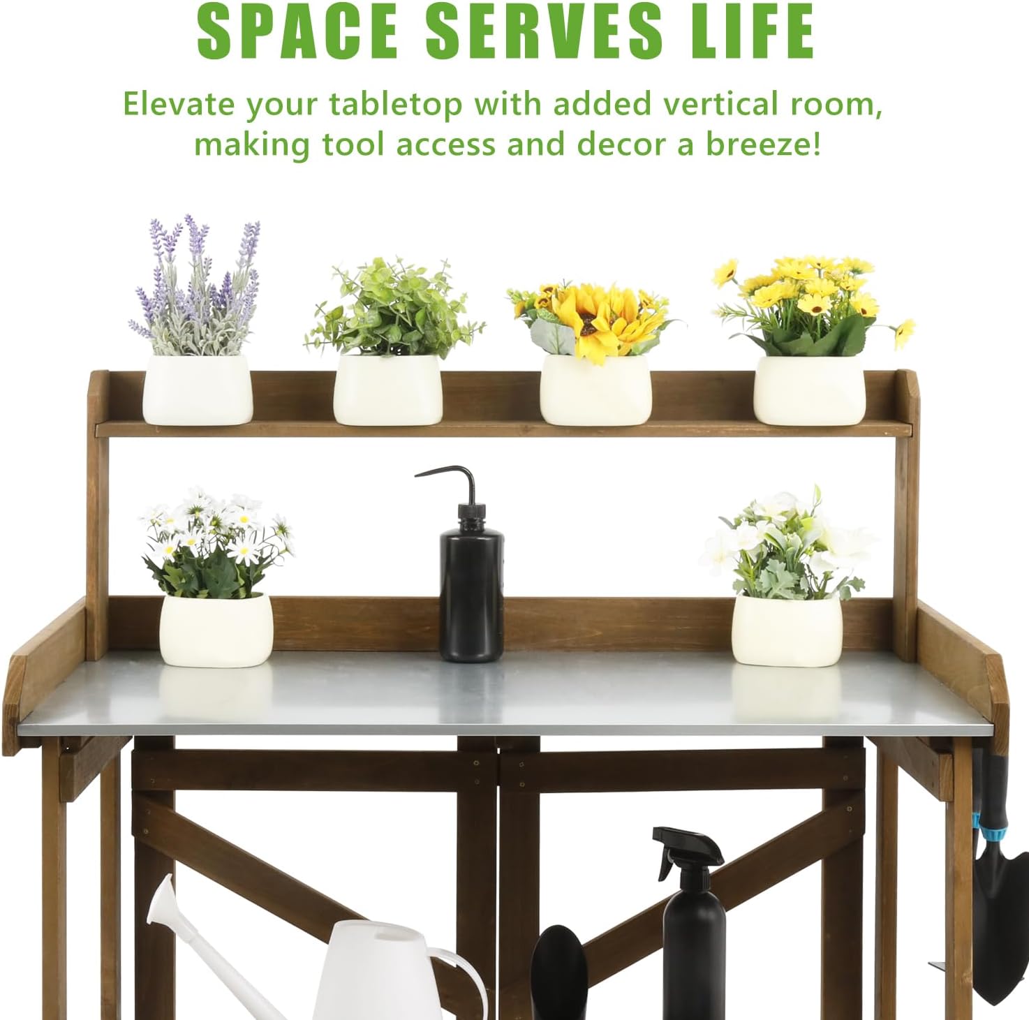 • INTEGRATED STORAGE SOLUTIONS: Equipped with 3 storage hooks, this bench offers specialized space for hand tools, additives, and other gardening essentials.