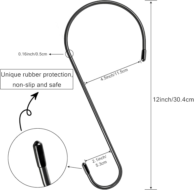 • Extra large size long s hook:Our extra large s hooks are up to 12 inches long, with a large opening of 4.5 inches wide and a small opening of 2 inches wide, and can be used as extension hooks for hanging plants, flower pots, and bird feeders. Please check the size before you buy to avoid a bad shopping experience for you.