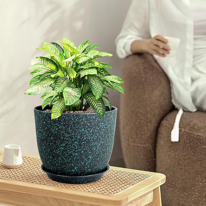 Plant Pots 9/8/7.5inch, Set of 3 Modern Decorative Plastic Planters with Drainage Holes and Saucer for Garden House Plants, Flower Pots for Indoor Outdoor Plants, Black with Green Speckles