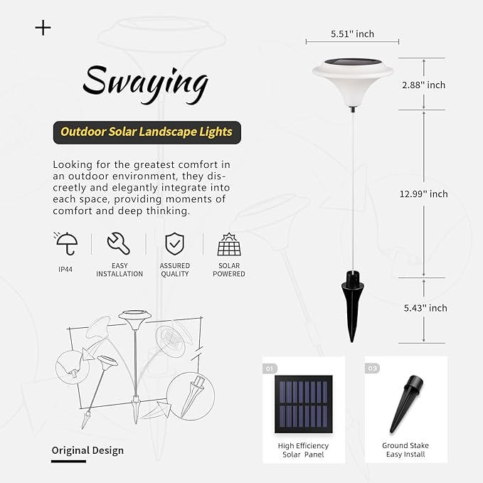 • 【Unique Design & Swaying in the Wind】Our solar garden lights feature an exquisite design that sways gently in the wind, adding a dynamic touch to your garden décor. They emit a soft, warm glow, perfect for garden, yard, or pathway decorations, creating a cozy atmosphere. These solar swaying garden lights are not just lighting fixtures; they are a statement in style and ambiance, inviting tranquility and charm into your outdoor spaces.