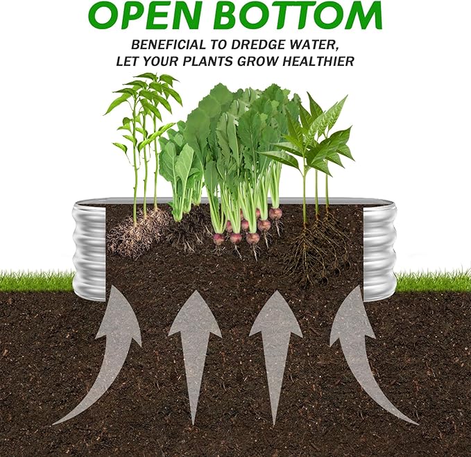 • 【Open Bottom】This metal raised garden bed is designed with an open base. It is good for drainage, and plants roots won't be sick from excessive water. Also, plants roots can absorb better nutrition from the soil, and grow more healthy.