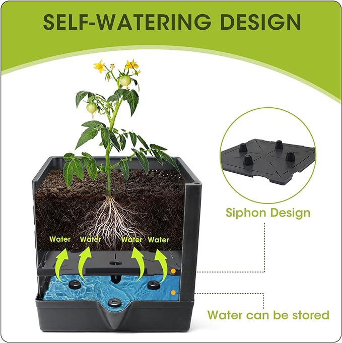 • SELF-WATERING SYSTEM: Self watering tomato planter with trellis has a built-in reservoir that ensures the plants receive consistent hydration. The bottom grid design utilizes the siphon effect, allowing the roots to pump water efficiently, minimizing the risk of under-draining or over-draining. There is a water injection port on the side, and the right amount of water is poured into the sowing box, without daily watering.