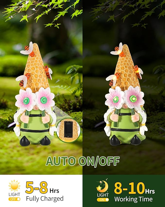 • 💡 LED Lighting: As dusk falls, watch the gnome’s flower eyes and bee come alive! The integrated LED lamp emits a soft glow, highlighting its intricate features.