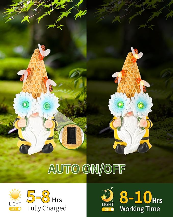 • 🐝 Charming Bee Lights - The bees’ tiny LED lights create an enchanting ambiance, making this gnome perfect for garden parties, birthdays, or simply brightening up your yard.