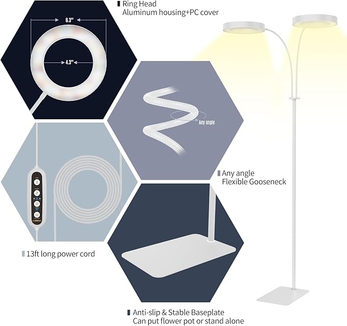 • 【Thoughtful Details】 The stable base will prevent the grow light from tipping over. The soft anti-slip pad underneath the base will protect the floor from damage. The power cord is upgraded to 13 ft long, suitable for more application scenarios .