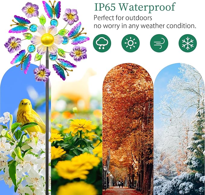 • 【Materials and Sizes】The wind spinner is made of 5 flowers and 5 delicate butterflys, and coated with rust proof coating to improve durability. Size: 40.9" H * 6.7" W * 11.2" L.