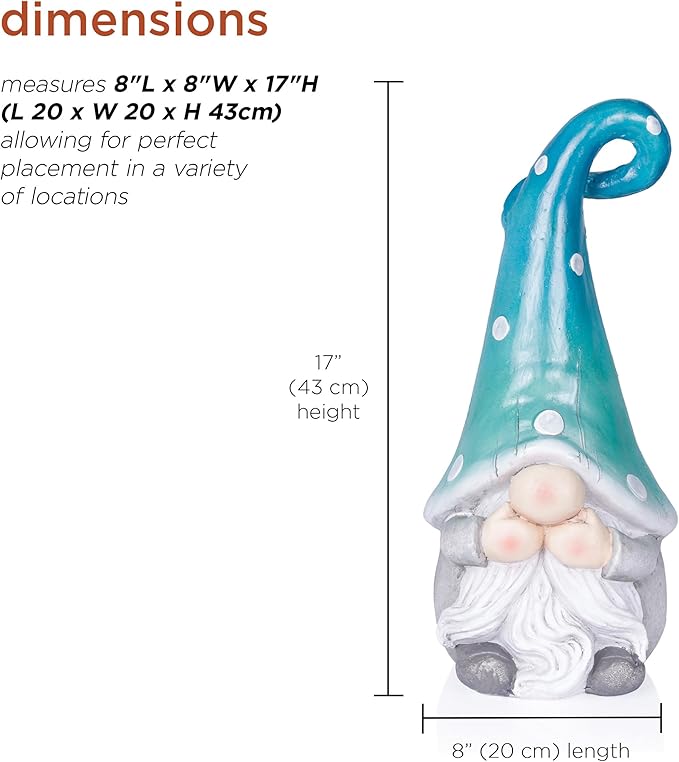 • IDEAL SIZE: Standing 17” high with dimensions of 8"L x 8"W x 17"H, this gnome statue is the perfect size to complement flower beds, walkways, patios, or your front yard without overpowering the space.