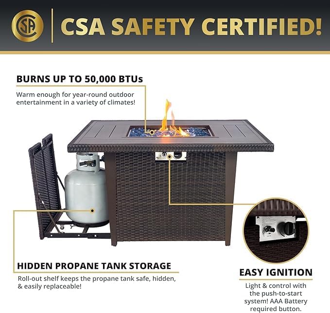 • 【Certified Safe & Ease of Use】Peace of mind comes standard with CSA certification for safe residential and commercial enjoyment. The convenient push-button ignition offers effortless lighting, while the discreet tank holder ensures your space remains neat and organized. Dimensions: 42” L x 42” W x 25'' H